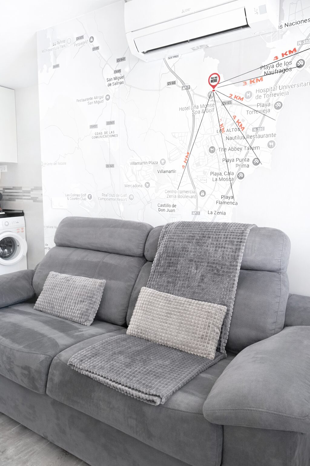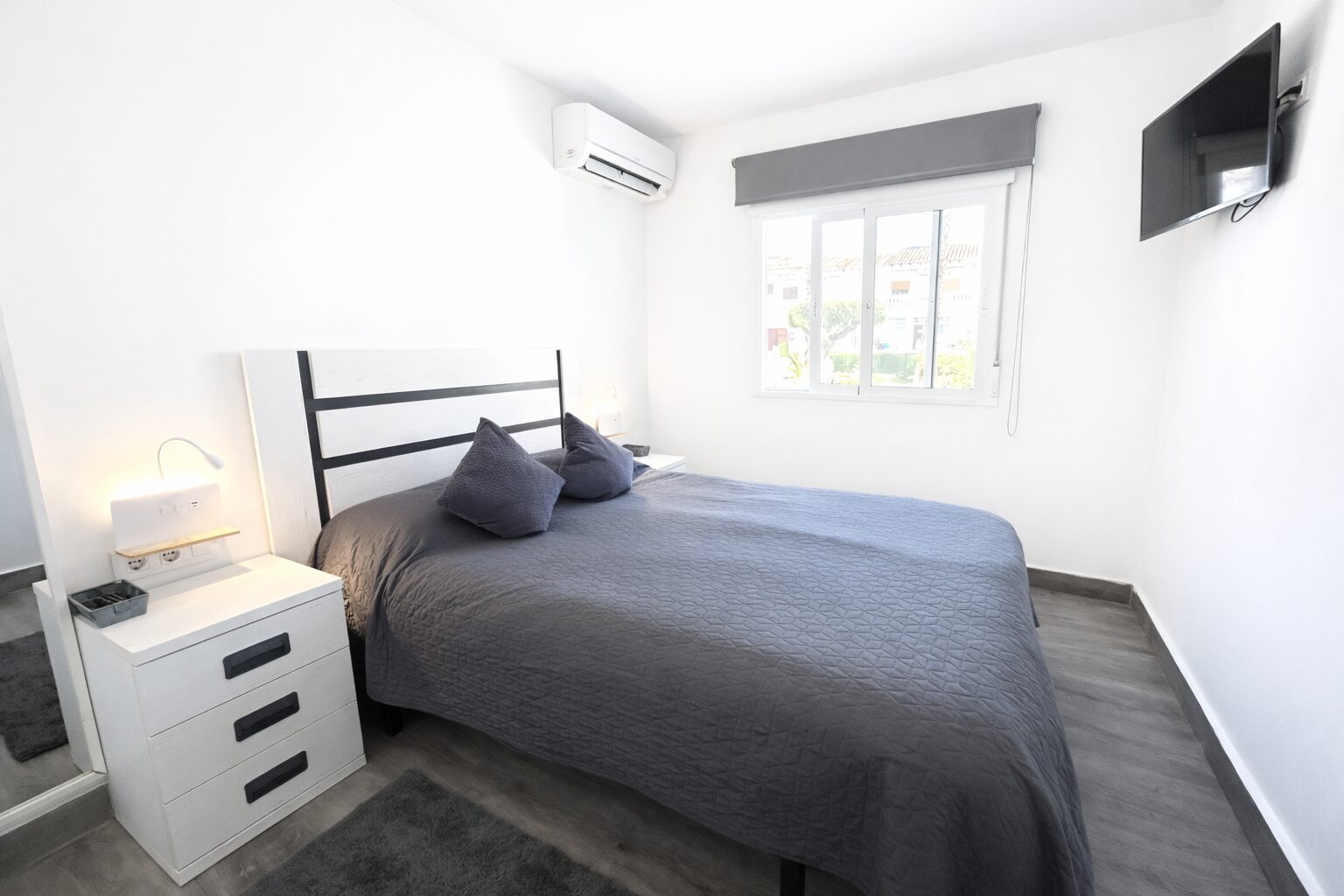 Bungalow with a 30m2 terrace, completely renovated, located in the Lago Jardín area (Manzana 3), in a beautiful development near the Laguna Rosa, a fantastic place to take walks or watch the sunrise. This area is a quiet area, has all the utilities, tennis courts, a beautiful park and various bars and restaurants. Just a five minute drive to the beaches In front of the house, you have a nice view of the community garden. Air conditioning (2), 2 Tv Europa, Wi-Fi